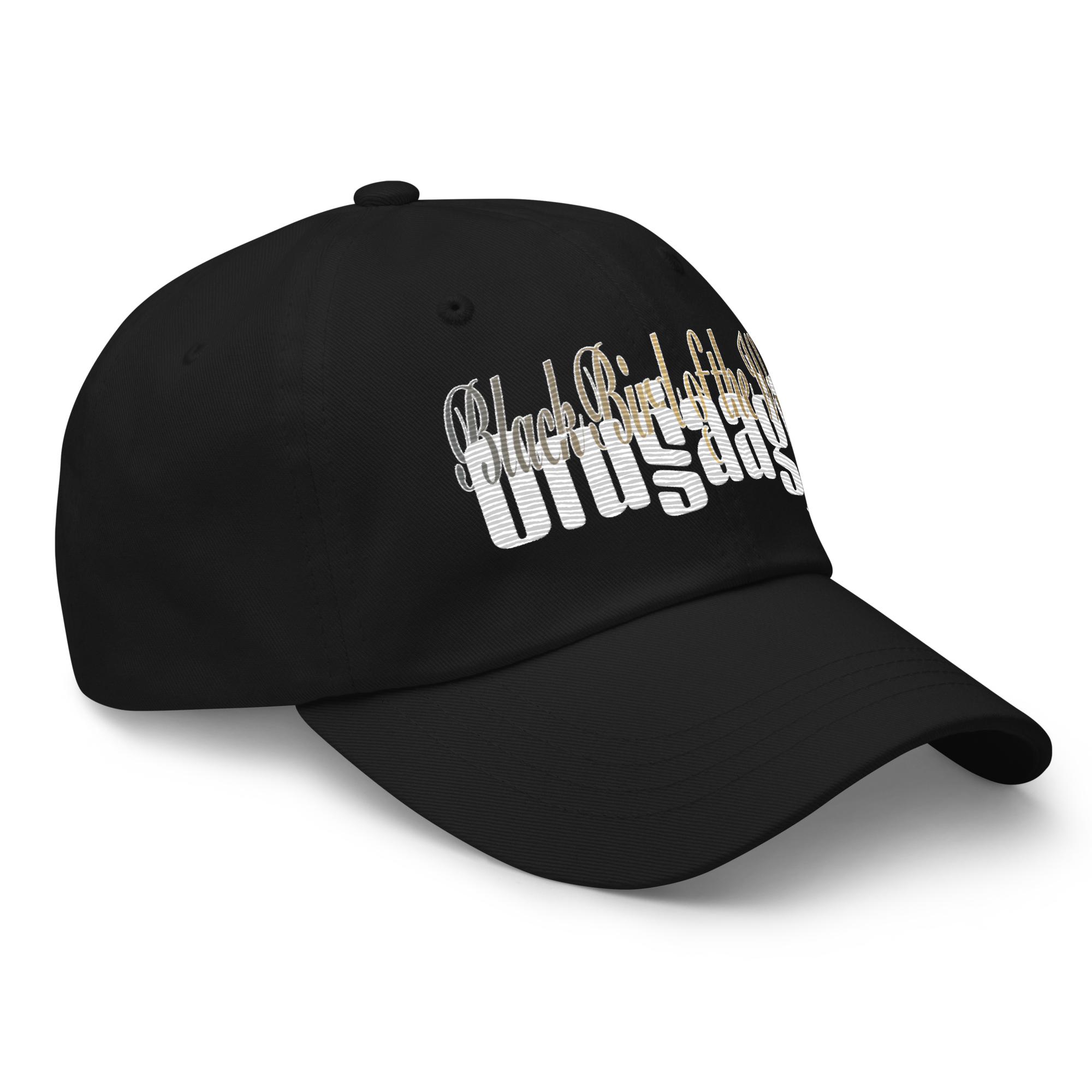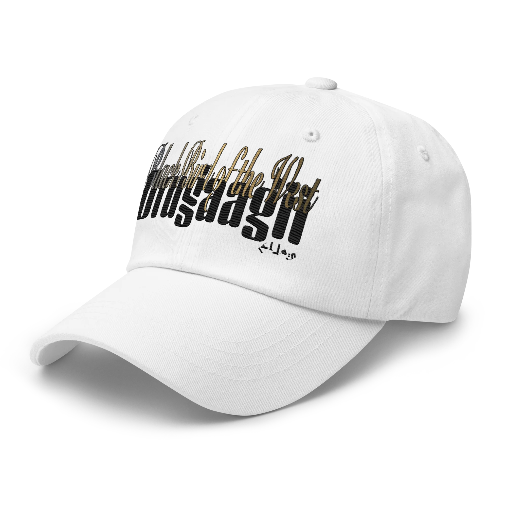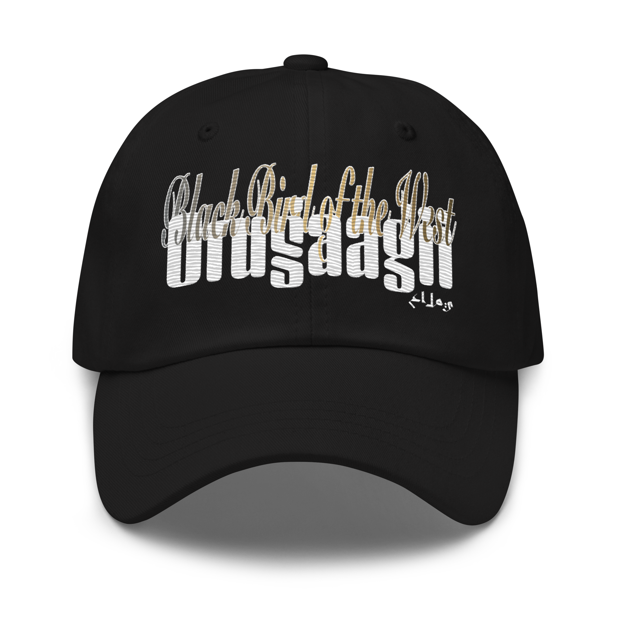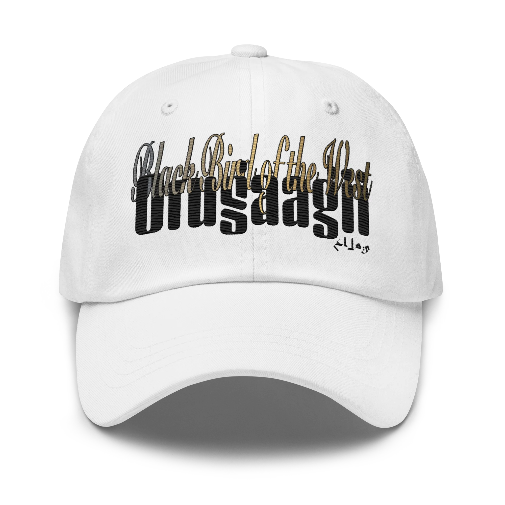Pure chino cotton twill with a embroidered variant of the Black Bird of the West typographic treatment on the front. One size fits all.